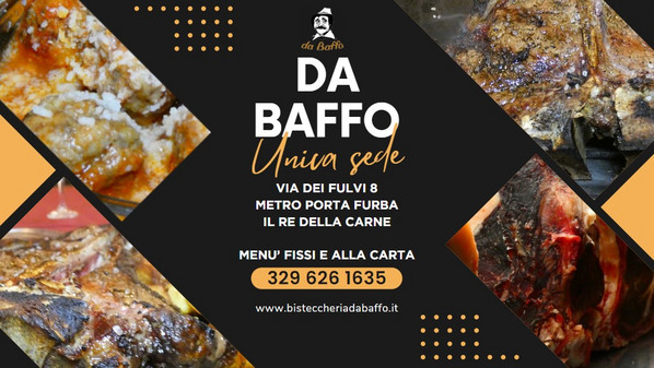“Da Baffo” è una bisteccheria specializzata nella cucina di carni alla brace. Il locale offre un menù ricco, con pietanze a base di carni pregiate, tartare, carpacci, tagliate, filetti e molto altro. Un vero e proprio paradiso per chi ama la carne. Il locale, inoltre, non tralascia i primi piatti della tradizione romana. Sì, sarà nostra premura accompagnarvi in un'esperienza culinaria fuori dagli schemi.