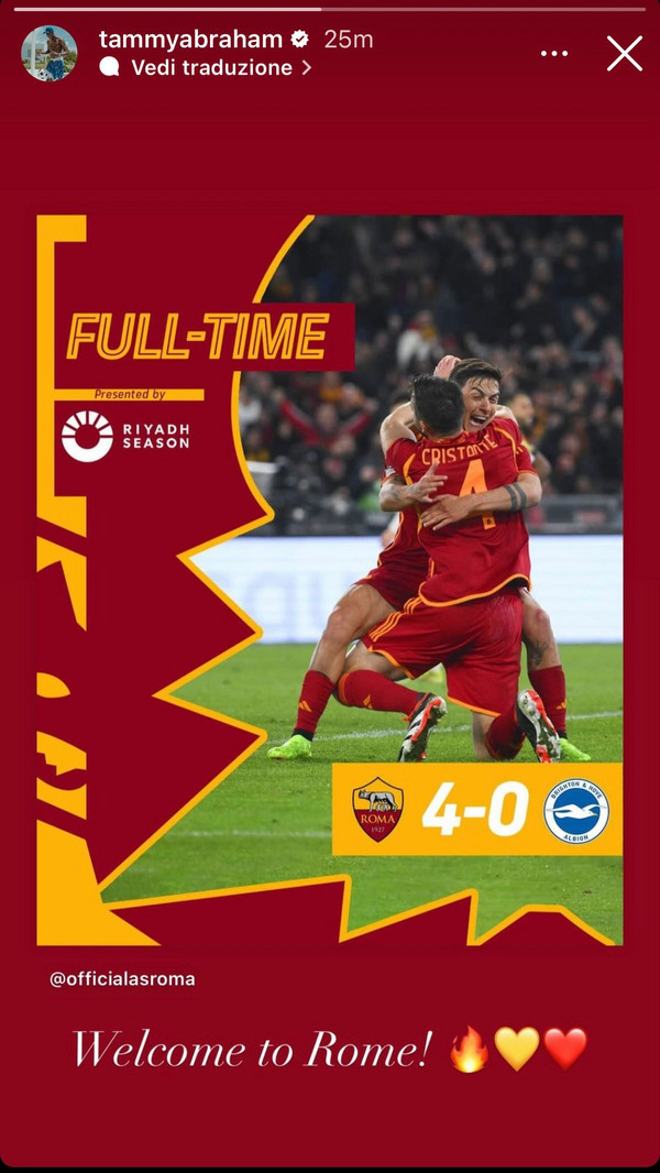 L’attaccante giallorosso Tammy Abraham , prossimo al rientro e oggi a bordocampo per seguire la sfida, festeggia così sul suo profilo personale la vittoria della Roma contro i suoi connazionali del Brighton : ” Benvenuti a Roma! ” le parole dell’in…